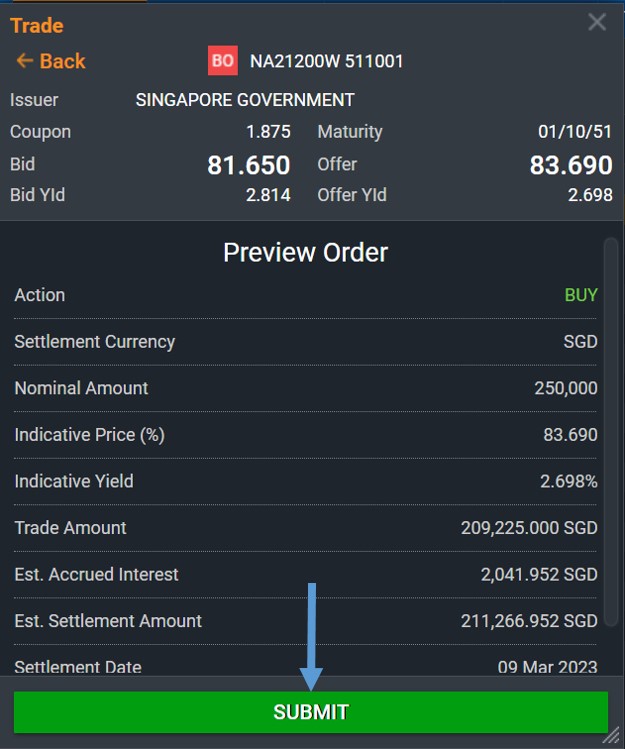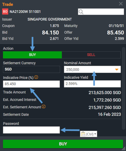 Similar to SGS Bonds, select Buy or Sell while indicating the Nominal Amount and Price that you are looking for and finally type in your password to place an order with us!