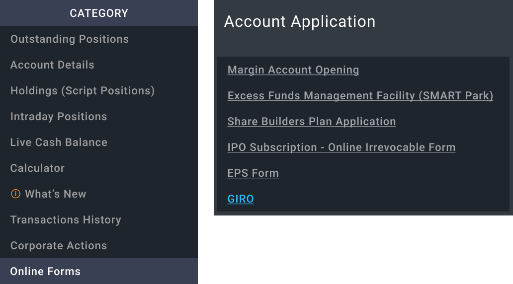 - Acc Mgmt > Online Forms > Account Application>GIRO>Select SBP (Account no.) > Choose the Bank>Apply