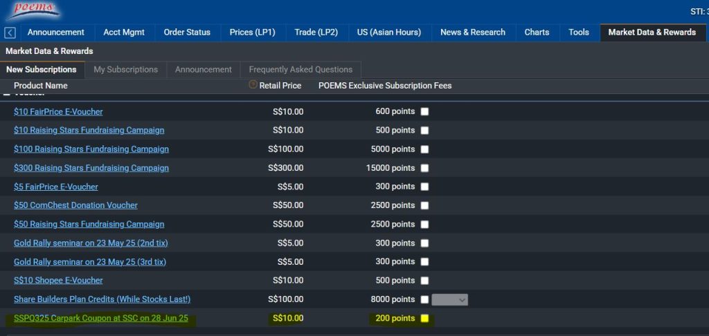 - Head to ‘Markets & Data Rewards’ tab, under Voucher to find “SSPQ325 Carpark Coupon at SSC on 28 Jun 25“