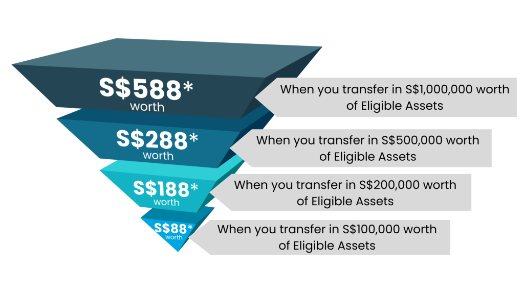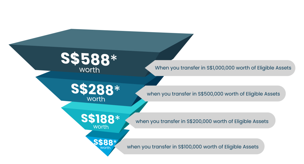 - Eligible Assets are all SGX-listed securities (e.g. shares, ETFs and bonds) and T-bills.
