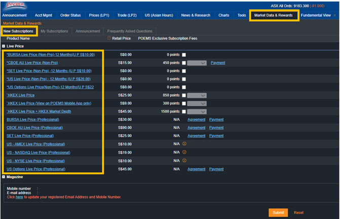 To find more information (i.e. Product Information, Terms & Conditions, Disclaimers etc.) regarding a particular product, please click on the respective product link in the “Me” Tab > “Market Data” --> “New Subscription” --> “More details” from various markets.