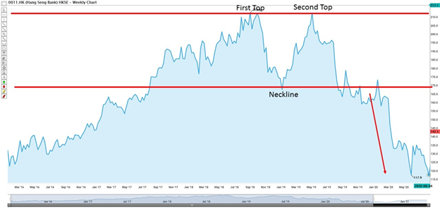 Hang Seng Bank’s price chart in Figure 3 illustrates a Double Top Reversal. The formation of this pattern is only completed when its neckline or support at 166 is genuinely broken. The price of Hang Seng Bank went down to HKD117 at the end of 2020.
