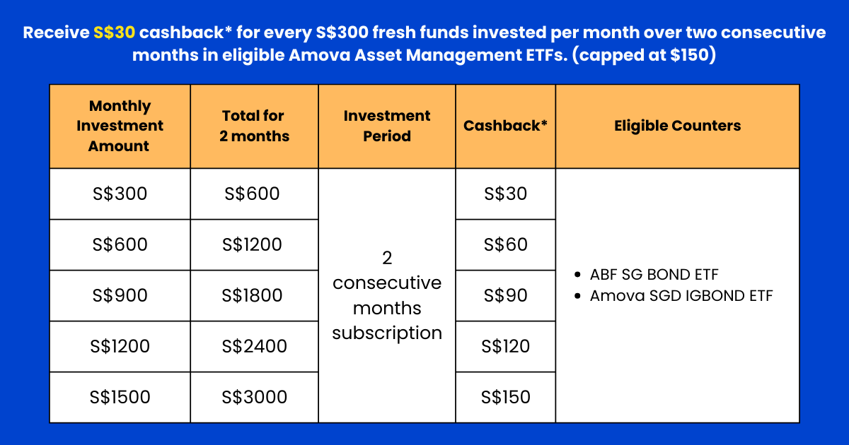 Month Investment counter Monthly Investment Amount Investment Period Cash Back January 2026 ABF SG BOND ETF S$100 Two consecutive months S$30 Amova SGD IGBOND ETF S$200 February 2026 ABF SG BOND ETF S$100 Amova SGD IGBOND ETF S$200 * This example should not be considered as financial advice.