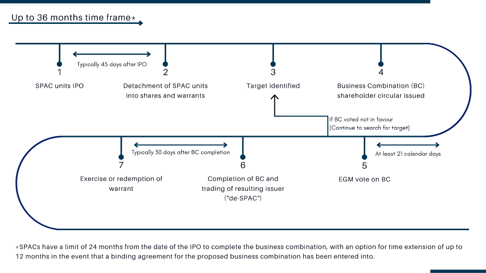 Investing in a SPAC listing can be largely seen as investing in the founding shareholders’ profile and abilities to identify companies and execute business combination transactions. SPAC sponsors must complete a business combination (i.e. de-SPAC) within 24 months from IPO with an extension of up to 12 months (subject to fulfilment of prescribed conditions).