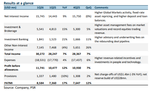 NII rose 9% YoY to US$15.7bn on Global Markets activity, fixed-rate repricing, and deposit (+3%) and loan growth (+9%). Sales and trading rose 13% YoY, with record equities revenue (+30%) partly offset by softer FICC (+2%, missed consensus). IB fees jumped 21% YoY to US$1.8bn; asset management fees +15% YoY. FY26e NII guidance raised to ~6% to 8% (from ~5% to 7%) and FY26e expenses expected to grow ~4% YoY.