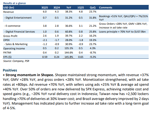 - 3Q25 revenue was in line with expectations, while PATMI underperformed mainly because Shopee’s higher logistics, fulfilment, and user-engagement investments. 9M25 revenue/PATMI was at 75%/60% of our FY25 estimates.