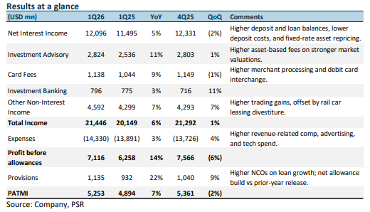 1Q26 earnings rose 7% YoY to US$5.3bn but came in slightly below our estimates, at 23% of our FY26e forecast. Revenue rose 6% YoY to US$21.4bn on NII growth (+5%) and non-interest income (+8%). All segments delivered YoY revenue growth. WFC closed its final outstanding consent order in March 2026. DPS rose 13% YoY to US$0.45, and 1Q26 common stock net repurchases rose 14% YoY to US$4bn.