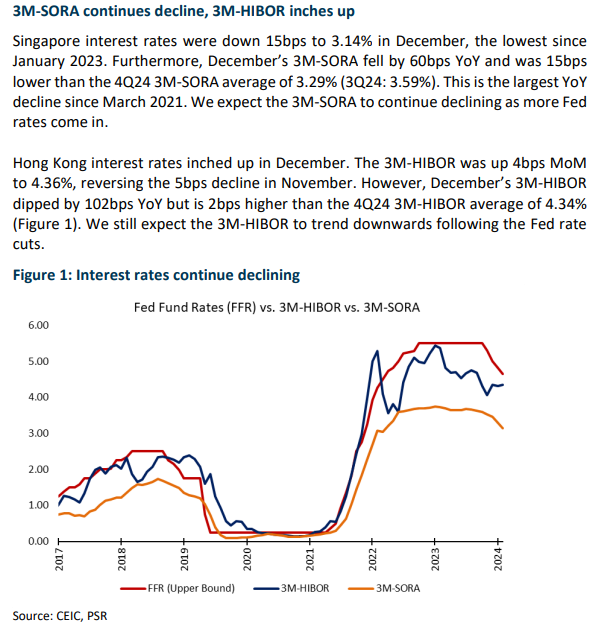 13 Jan 2025- December’s 3M-SORA was down 15bps MoM to 3.14%, the lowest since Jan 2023 and 15bps lower than the 4Q24 average. We expect the 3M-SORA to decline in tandem with the Fed Rate cuts of 100bps. Banks rallied 34% in 2024 from strong results, lowered rate cut expectations, and possibly higher dividends/share buybacks.