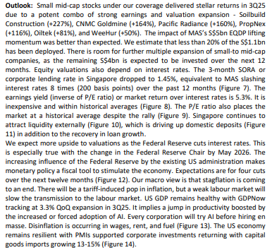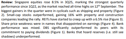 2 Oct 2025- Singapore equities rose 8.5% in 3Q25, marking the strongest quarterly performance since 1Q22, as the market reached all-time highs on 12th September. Small mid-cap stocks under our coverage delivered stellar returns in 3Q25 fuelled by a potent mix of strong earnings and valuation expansion.