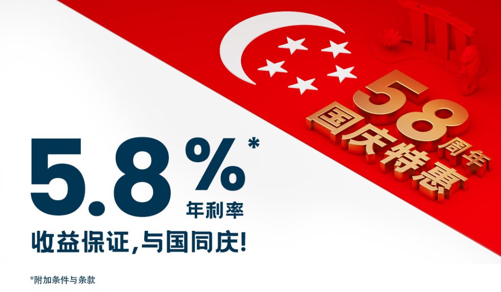 条款与条件 与国同庆,享有收益保证高达5.8%*的回报!- 促销期:从2023年8月1日(0000小时)至2023年8月31日(2359小时),包括首尾两天。