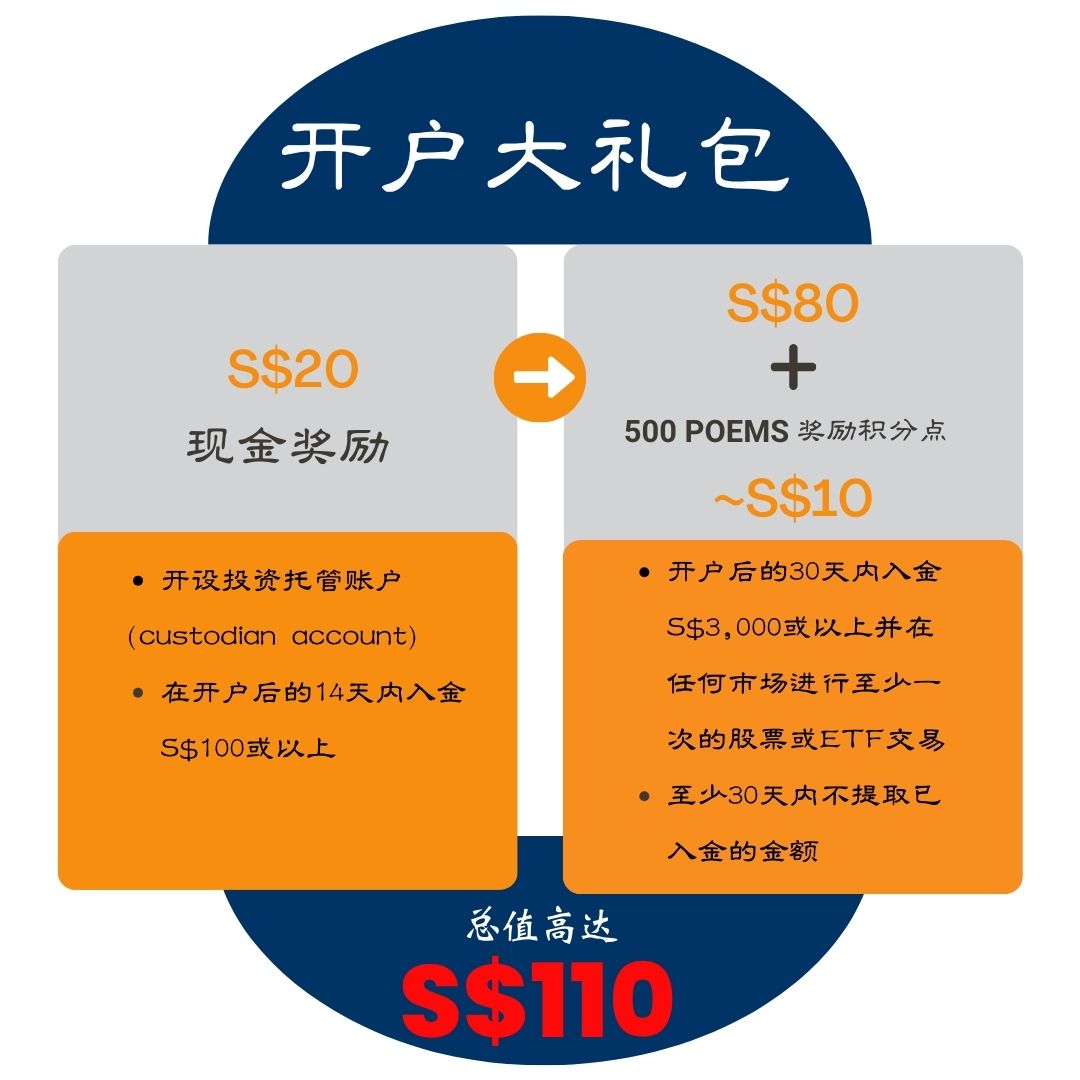 从2023年3月6日至2023年12月31日,使用此专属链接 开设一个新的辉立环球账户并完成一次股票或交易所交易基金(ETF)交易,即可获得高达S$100现金券和500 POEMS奖励积分点。