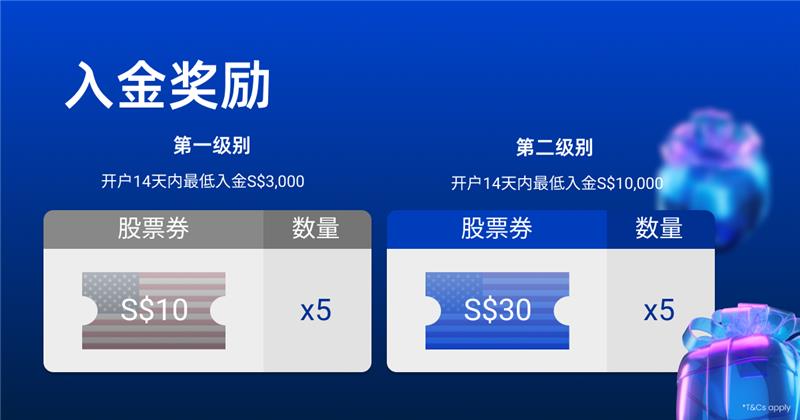 – S$10×5张美股股票券 - 开户后14天内存入至少S$10,000(“初始资金”),并持有该资金至少30天方可兑换